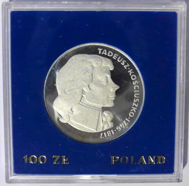 Srebrna moneta kolekcjonerska o nominale 100 zł z 1976 roku - Tadeusz Kościuszko. Sprzedawane monety z oryginalnych kapslach.