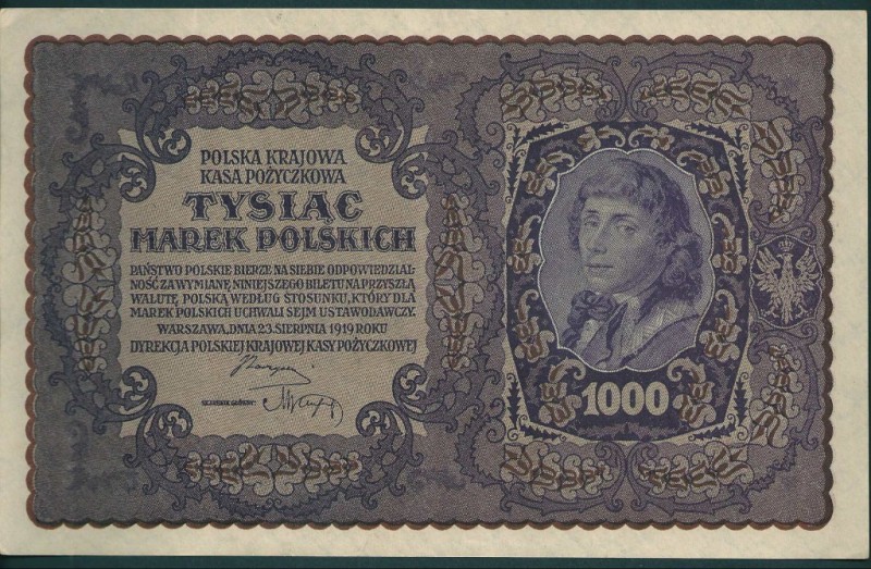 1919 r. 1000 Marek Polskich. Banknot Stan UNC I. II Seria L typ IV Nr 147,941. z 23 sierpnia 1919 r. Poz.29 c. Polecam