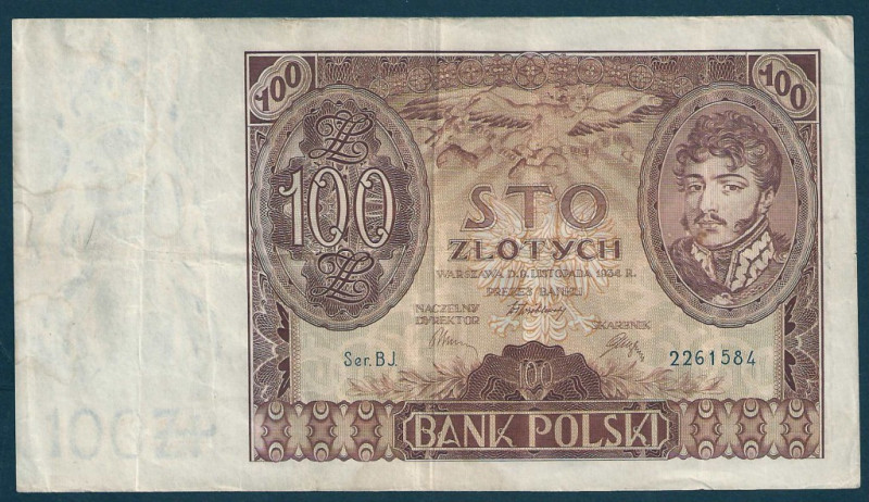 1934 r. 100 zł Józef Poniatowski. Banknot Stan III Seria BJ. Nr. 2261584. Nr. Kat. 74. Polecam