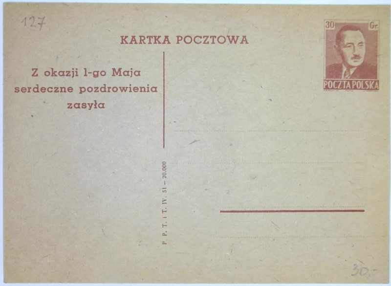1951 r. Kartka Pocztowa Cp 127** - z okazji 1-go maja