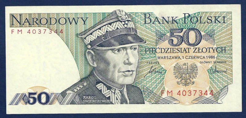 1986 r. 50 zł. Świerczewski. Banknot. UNC . Nr. 165. Seria FM. Polecam