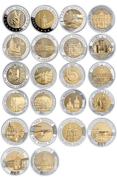 W komplecie znajduje się zestaw dwudziestu jeden monet 5 złotowych. Istnieje również możliwość zakupienia monet poza kompletem.