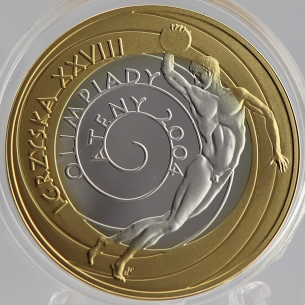 Moneta została wyemitowana, aby upamiętnić Igrzyska XXVIII Olimpiady – Ateny 2004. Na rewersie widnieje wizerunek dyskobola z amfory panatenajskiej. Moneta została wykonana z dwóch rodzajów stopów srebra (Ag 925) oraz złota (Au 999). Moneta jest platerowana.