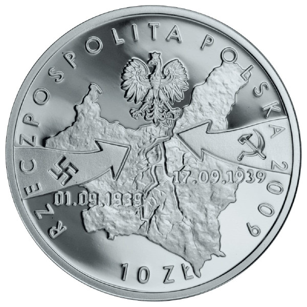 Moneta została wyemitowana, aby upamiętnić wydarzenia z Września 1939 roku. Na rewersie widnieją wizerunki trzech samolotów Junkers na tle chmur i spadających bomb. Między chmurami widoczny jest wizerunek ratusza z Bramą Krakowską w Wieluniu. Na awersie widnieje wizerunek terytorium Rzeczypospolitej Polskiej w granicach z 01.09.1939 r. Pośrodku terytorium znajduje się wizerunek pęknięcia. Z lewej strony widnieje wskaźnik z symbolem swastyki, natomiast z prawej strony wskaźnik z symbolem sierpa i młota skierowanego na terytorium Rzeczypospolitej Polskiej. Wskaźniki oraz symbole charakteryzują niemiecką i radziecką agresję.