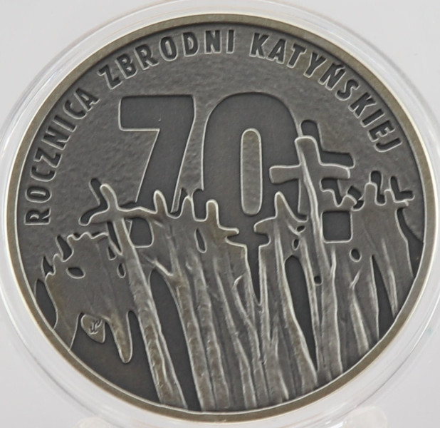 Moneta została wyemitowana, aby upamiętnić 70. rocznicę zbrodni katyńskiej. Na rewersie widnieją wizerunki pni drzew, których górne partie przedstawiają krzyże. Na awersie na tle konturu polskiego orła wojskowego, napisy: KATYŃ, KALININ, CHARKÓW, MIŃSK, CHERSOŃ, KIJÓW.