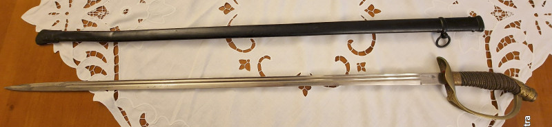Głownia prosta, stalowa, niklowana, dług. 801 mm, szer. u nasady 22 mm, wklęsło szlifowana w dwie bruzdy. Na progu nasady zewnętrznego płazu wybite połączone marki firmy Weyersberg, Kirchbaum & Cie - głowa króla i rycerza w szyszaku, pod nimi litery W K &C. Oprawa rękojeści zamknięta, mosiężna. Jelec kabłąkowo tarczowy, zi. . Trzon rękojeści drewniany, karbowany, pokryty czarną skórą, opleciony potrójnym, skręconym drutem mosiężnym. Pochwa z blachy stalowej, pokryta czarnym lakierem. Przy górnej dodatkowa antabka od wewnątrz. Szyjka zamknięta kołnierzem mocowanym wkrętką. W dole zakończona równoramienną ostrogą z grubej blachy.
