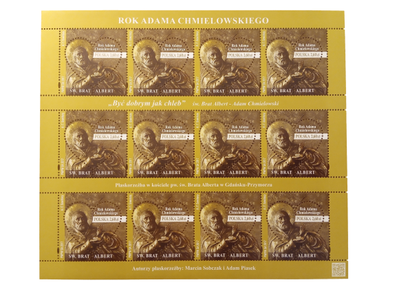 Na znaczku przedstawiono fragment płaskorzeźby z kościoła pw. św. Brata Alberta w Gdańsku-Przymorzu, autorstwa Marcina Sobczaka i Adama Piaska, przedstawiającej postać Adama Chmielowskiego - św. Brata Alberta.