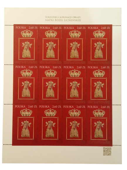 Znaczek wydany z okazji 50. rocznica koronacji obrazu matki Bożej Licheńskiej. Obraz Matki Boskiej Licheńskiej - Bolesnej Królowej Polski – znajduje się w Bazylice Matki Bożej Bolesnej w Licheniu. Ten wizerunek Matki Boskiej powstał w drugiej połowie XVIII wieku. Otoczony jest szczególnym kultem wśród wiernych Kościoła rzymskokatolickiego i uważany jest za cudowny.