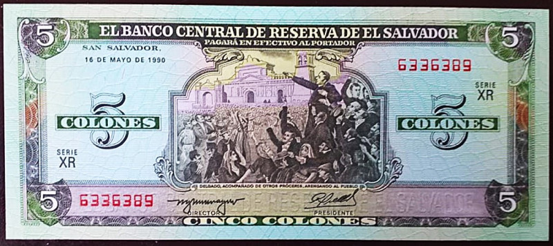 Banknot z Salwadoru 1990-P138a-5 kolonów. Stan zachowania bankowy UNC! Walor ze zdjęcia! Wyprzedaz kolekcji! Polecam!
