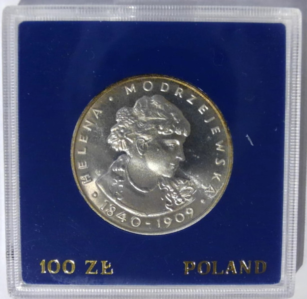 Srebrna moneta kolekcjonerska o nominale 100 zł z 1975 roku - Helena Modrzejewska