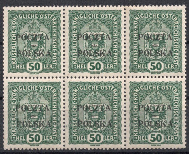 1919 Wydanie Krakowskie Fi 41 forma I poz 16-18, 26-28. 6szt-blok. Gwar i opisy Wiatrowski. Wszystkie czyste bez podlepki ani jej śladu, stan bardzo dobry. 50h.