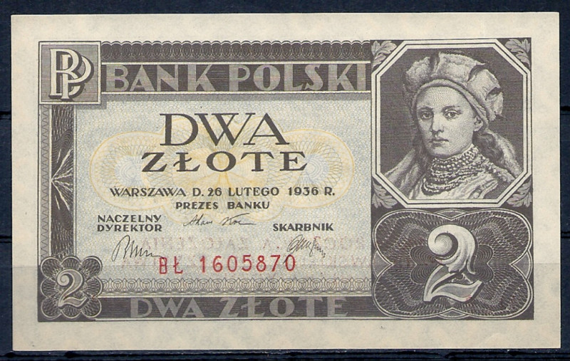 1936 r. 2 zł UNC. Seria BŁ. Banknot z pieczątką 120-ta Rocznica Założenia Warszawskiego Towarzystwa Numizmatycznego. Polecam