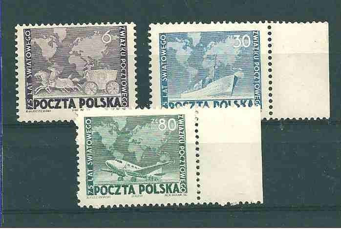 1949 r. Fi 498 - 500**. 75 Rocznica światowego Związku Pocztowego. Znaczki czyste z klejem bez podlepki. Polecam