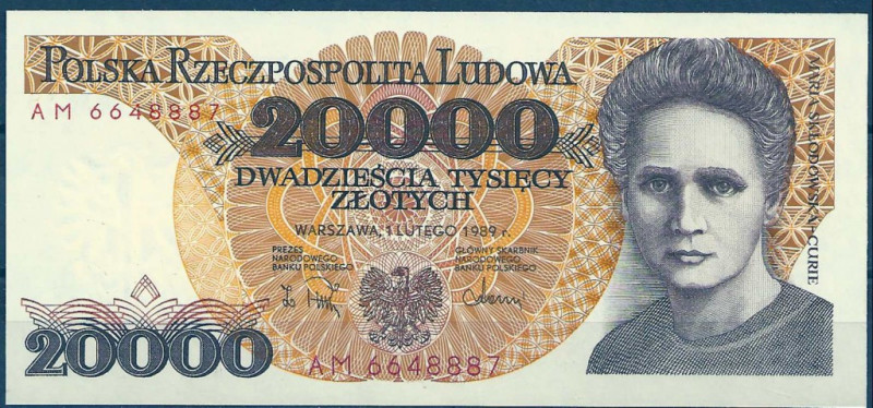 1989 r. 20 000 zł. Maria Skłodowska - Curie. Banknot UNC. Seria AM. Nr. 6648887. Nr. kat. 175b. Polecam