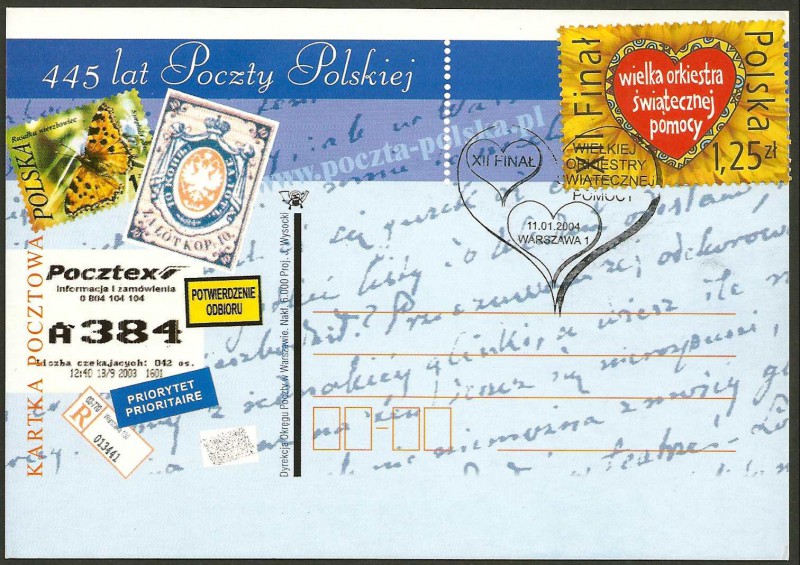 2004 r. Kartka Pocztowa 3942. XII Finał WOŚP. 11.01.2004. z znaczkiem pocztowym. Kartka w bardzo dobrym stanie . Polecam