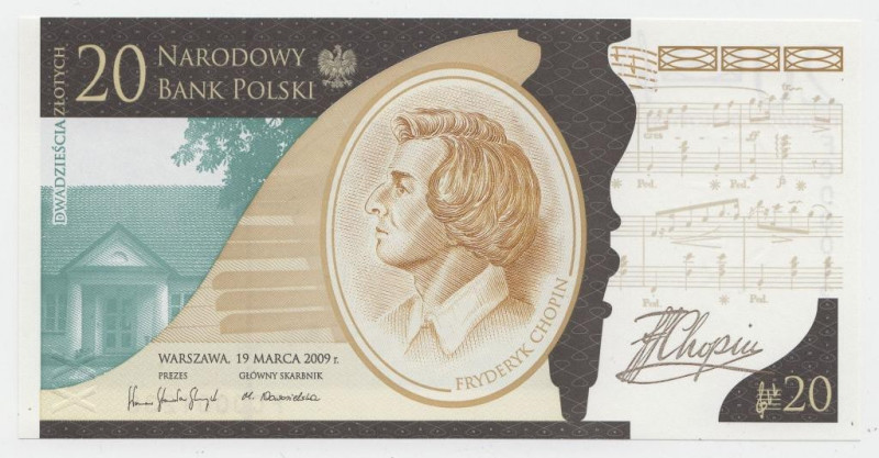 2009 r. 20 zł. Fryderyk Chopin. Banknot w etui bankowaj UNC o numerze seryjnym Nr. FC 0055235. Polecam