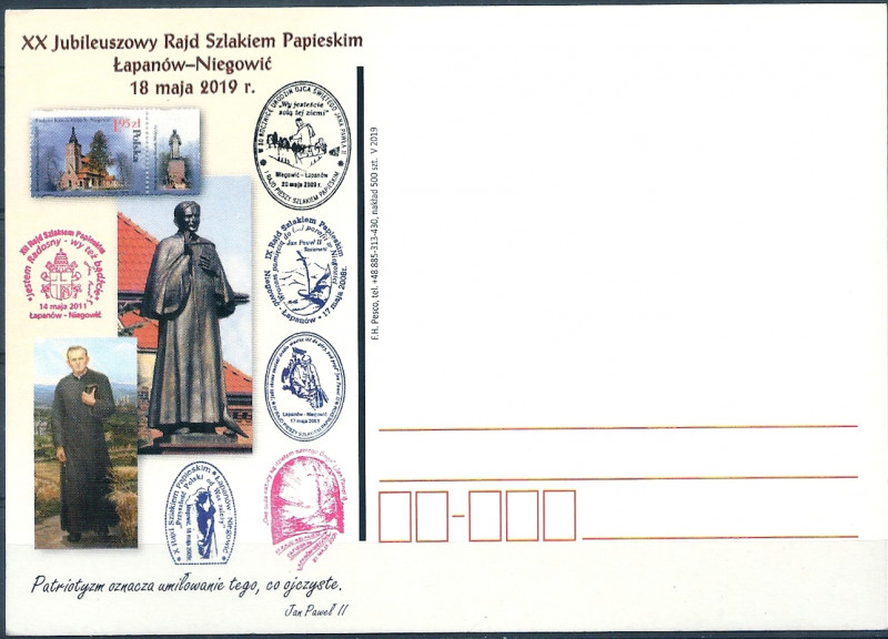 2019 r. XX Jubileuszowy Rajd Szlakiem Papieskim. Kartka nowa. Nakład 500 szt. Polecam
