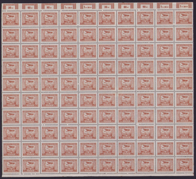 Poczta Lotnicza. Arkusz sprzedażny Fi 218 ** składający się z dwóch arkuszy zawierających 50 klisz znaczków w układzie 10 x 5.
