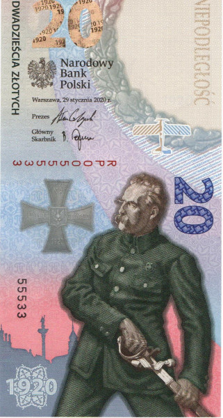 Pierwszy w historii Polski banknot kolekcjonerski w układzie pionowym wyemitowany dla upamiętnienia 100. rocznicy Bitwy Warszawskiej.