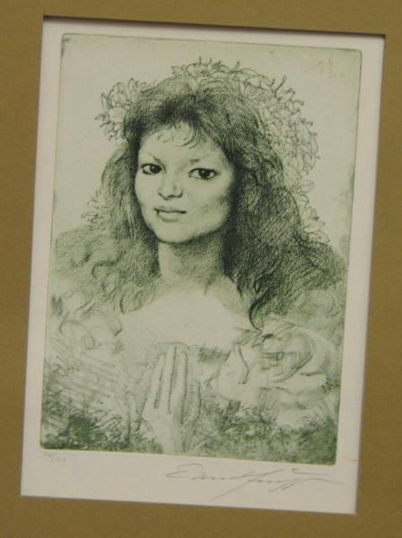 Ernst Fuchs akwaforta "Dziewczyna z kwiatami we włosach" Numerowana i podpisana 46/100. Ciemnozielony druk. Wymiary odcisku 23,5:17 cm. Wielkość arkusza 48:32 cm.