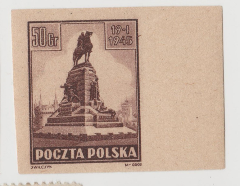 Przedmiotem aukcji jest Znaczek z serii Zabytki Krakowa z 1945 roku.