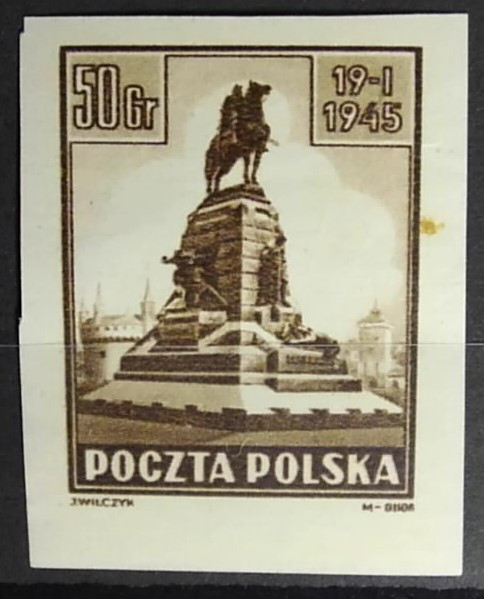 Przedmiotem aukcji jest Znaczek z serii Zabytki Krakowa z 1945 roku.