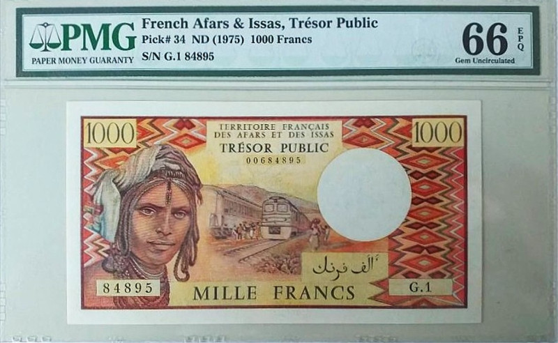 Bardzo rzadki banknot z Francuskiego Terytorium Afarów i Issów 1975-P34-PMG 66.