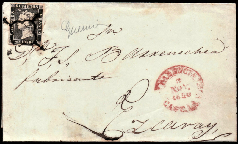 Klasyka! Koperta z Hiszpanii 1850 z pierwszym znaczkiem tego kraju wg katalogu Edifil nr 1a!