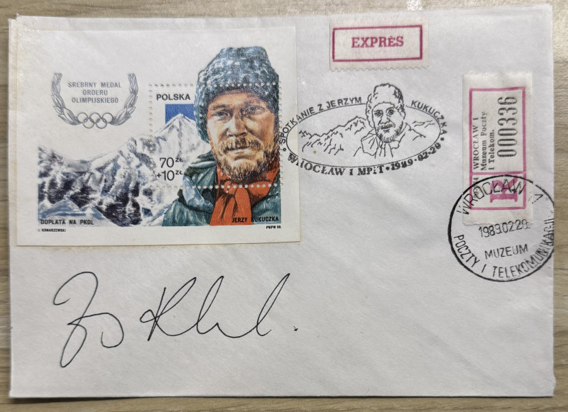 koperta Z oryginalnym podpisem Jerzego Kukuczki - słynnego polskiego himalaisty zdobywcy 14 ośmio tysięczników wraz z bloczkiem według kat Fischera nr. 136 i okolicznościowym stemplem ze spotkania