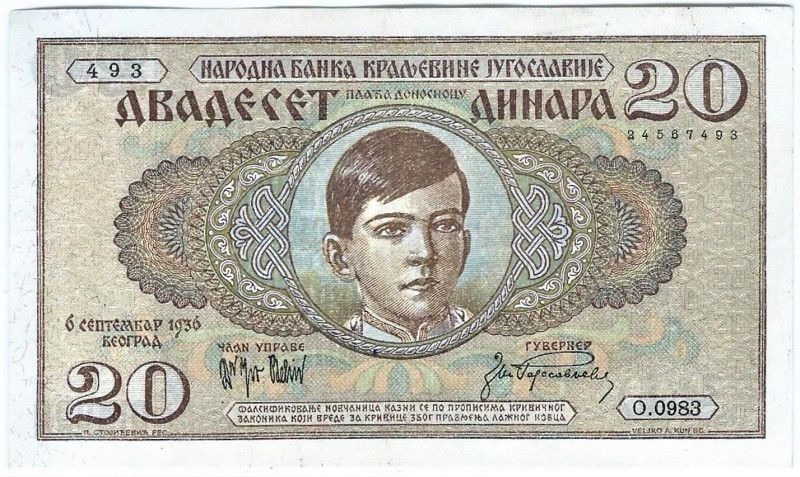 Banknot z Królestwa JUgosławii 1936-20 dinarów. Stan zachowania AUNC! Wyprzedaż kolekcji! Polecam!