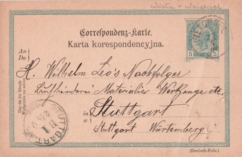 Karta korespondencyjna z Wisły do Sztutgartu