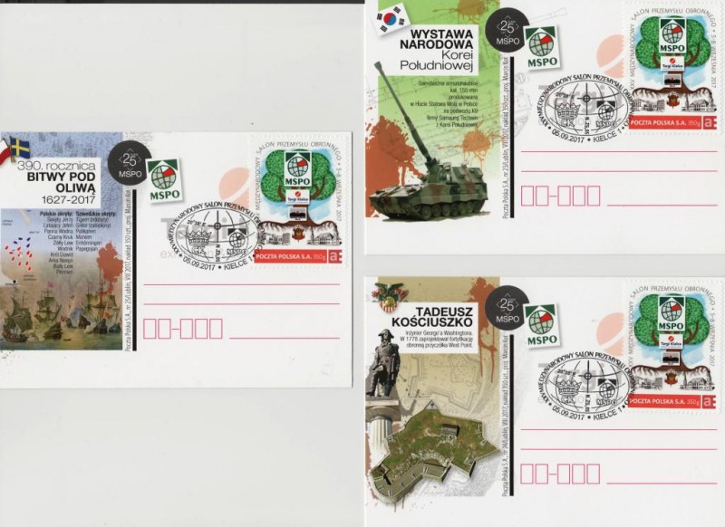 Do sprzedania kartki z okolicznościowym znaczkiem i kasownikiem wydane z okazji Międzynarodowego Salonu przemysłu Obronnego 2017