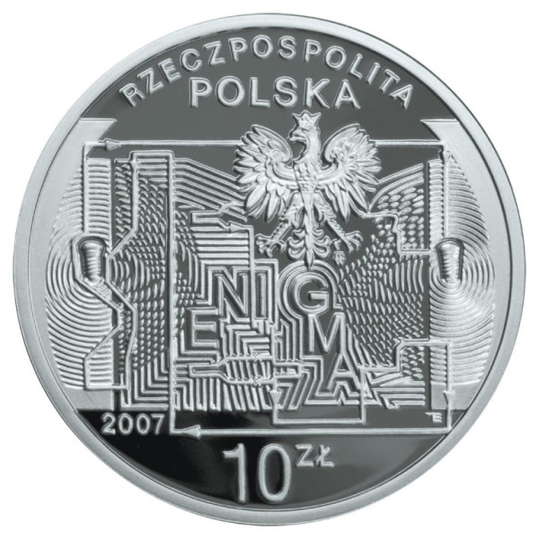 Moneta została wyemitowana, aby upamiętnić 75. rocznicę złamania szyfru Enigmy. Na rewersie widnieje umowny labirynt połączeń nawiązujący do działania maszyny szyfrującej Enigma. Natomiast w środku został przedstawiony napis: ENIGMA oraz 1932 odwrócony o 180 stopni. W otoku napis: 75. ROCZNICA ZŁAMANIA SZYFRU ENIGMY.