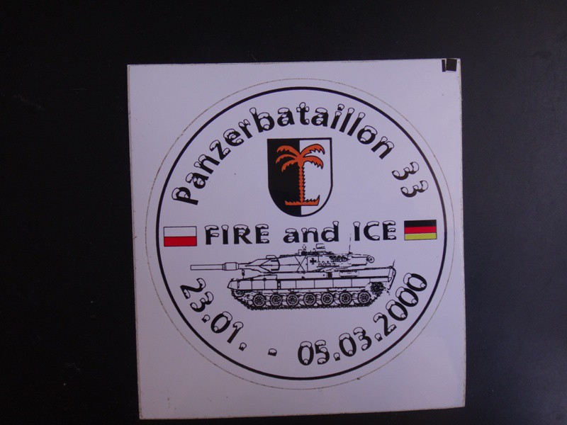 Naklejka okolicznościowa związana z pierwszym po II wojnie światowej pobytem niemieckich wojsk na poligonie Orzysz. 33 batalion czołgów z Neustadt był tym pierwszym. Rok później szkolenie zimowe powtórzył 393 bcz i na tym się skończyło. Jako bonus naklejka symbol 33 batalionu który jak widać kontynuuje tradycje jednostek pancernych AK Romla. Tradycje wojskowe a nie ideologiczne.