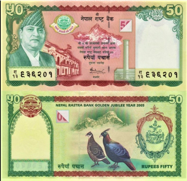 Piękny banknot okolicznościowy z Nepalu 2005 wydany z okazji 50 lat Narodowego Banku Nepalu.