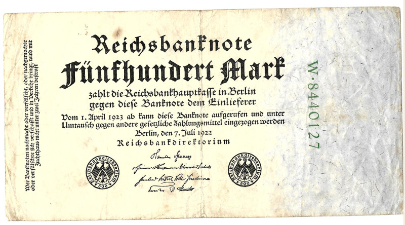 Banknot 500 marek (Niemcy 1922) Stan: widoczny na załączonych scanach.