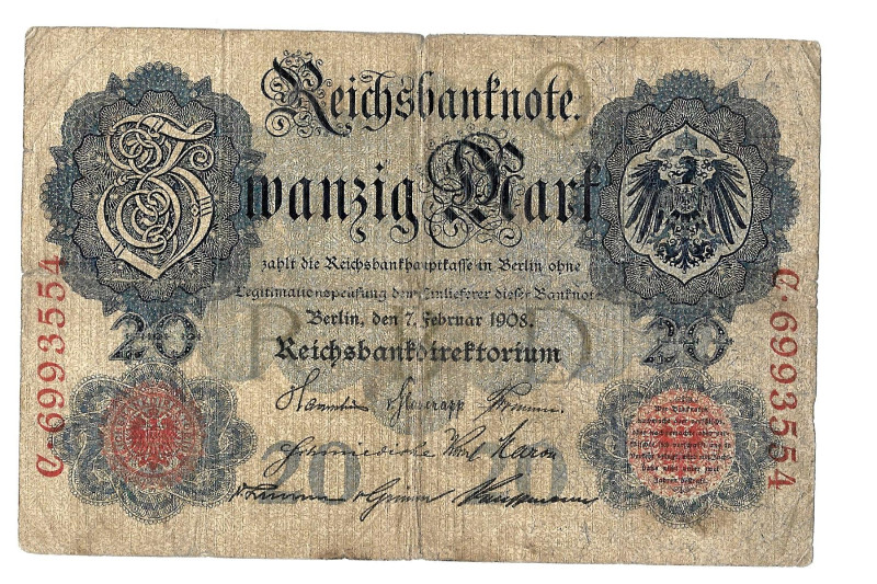 Banknot 20 marek (Niemcy 1908) Stan: widoczny na załączonych scanach.