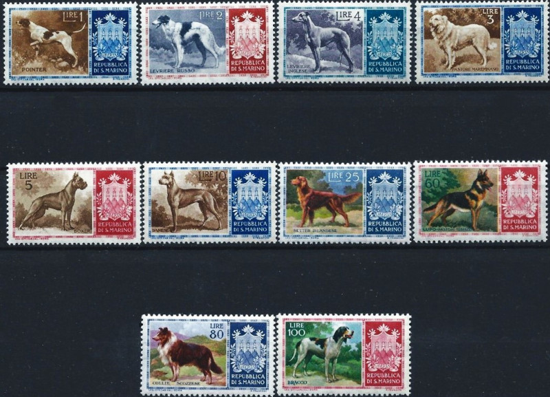 Kompletna seria z San Marino 1956 - psy. Wszystkie znaczki w stanie idealnym MNH**! Wyprzedaż kolekcji! Polecam!