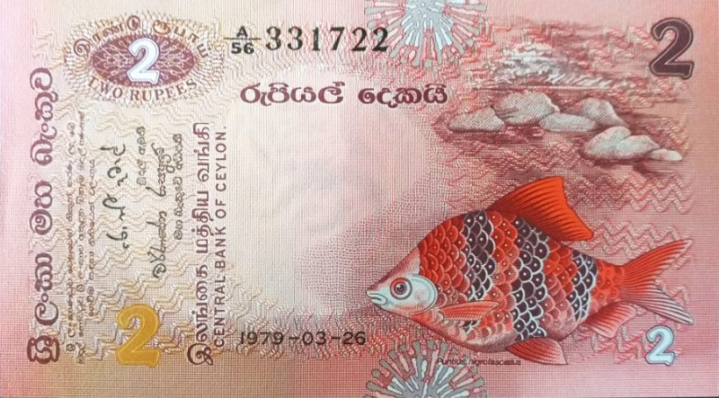 Banknot z Cejlonu-Sri Lanki 1979-P83-2 rupie-ryby. Stan zachowania UNC. Walor ze zdjęcia! Wyprzedaż kolekcji! Polecam!
