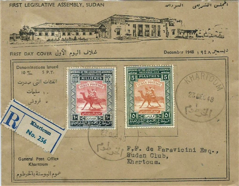 Koperta polecona FDC z Sudanu 1948 wydana z okazji pierwszego posiedzenia zgromadzenia ustawodawczego.