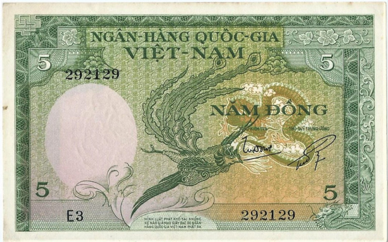 Banknot z Wietnamu Południowego 1955 - 5 dong. Stan zachowania AUNC. Wyprzedaż kolekcji! Polecam!