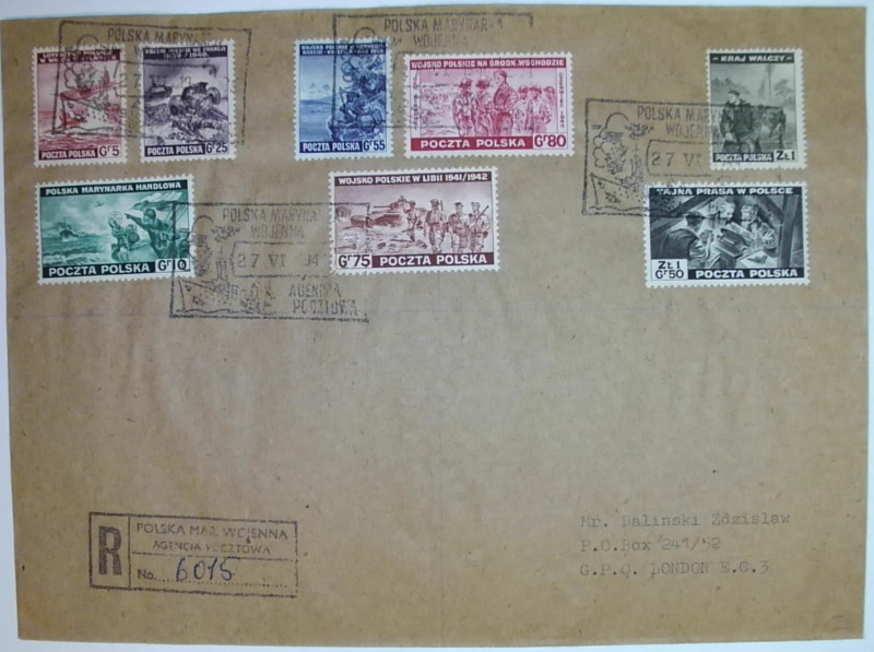 II wydanie Polskiego Rządu na Emigracji w Londynie, list do Londynu ofrankowany całą serią nadany 27.VI.1943 r. działalności Poczty Polskiej na Emigracji w agencji pokładowej Polskiej Marynarki Wojennej nr 1 na niszczycielu ORP "Piorun"