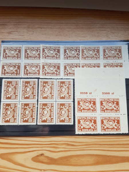 Oferuję zestaw znaczków, Dopłaty, Trąbka Pocztowa z 1949 r. w formie czwórek, stan czysty**. występują marinesy, pustopole i liczba rozrachunkowa. 10 czwórek z serii, część nieząbkowana, reszta ząbkowana. Różne papiery i odmiany ząbkowań.